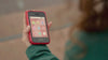 Nærbilde av en rød Xplora-mobil i hånden som viser Skolemodus på skjermen.